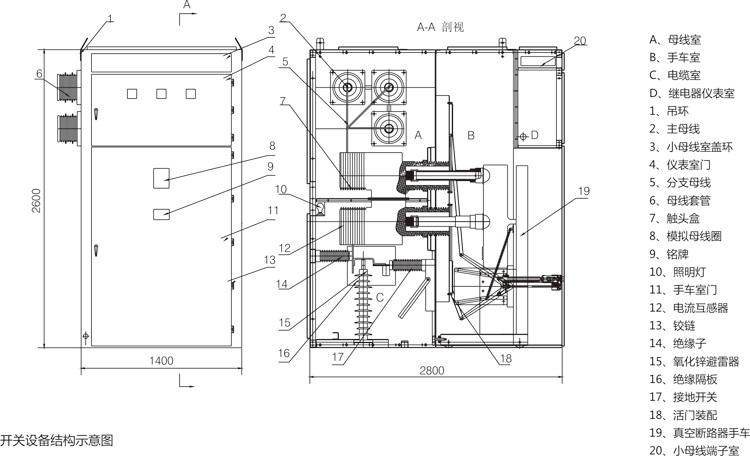 本開關設備具有電纜進出線、架空進出線、母線聯(lián)絡、隔離、電壓互感器、避雷器等主電路方案。母線采用復合絕緣,相間及連接頭配有用阻燃材料注塑而成的絕緣套,主母線相鄰柜間用母線套管隔開,能有效地防止事故蔓延,同時對主母線起到輔助支撐作用。電纜室裝有接地開關、過電壓保護裝置等。