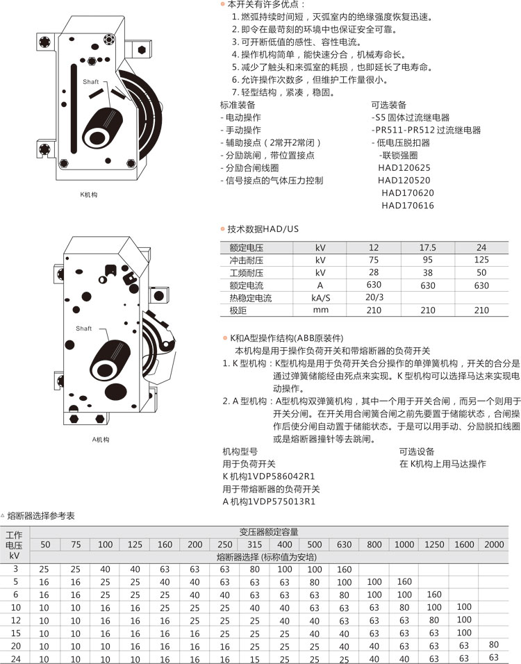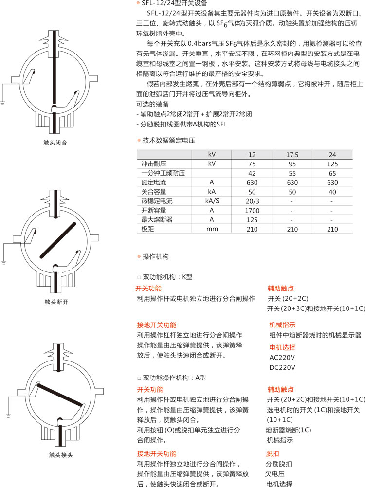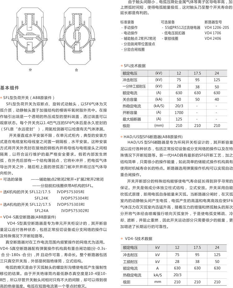 環(huán)網(wǎng)柜的主開關(guān)、操作機(jī)構(gòu)及元器件采用ABB公司原裝件或采用進(jìn)口部件國內(nèi)組裝生產(chǎn)的SFL-12/24型 開關(guān)設(shè)備,也可根據(jù)用戶需要配裝ABB公司原裝HAD/US型SF6。斷路器或VD4-S型真空斷路器,其操作方式分為手動(dòng)、電動(dòng)兩種。