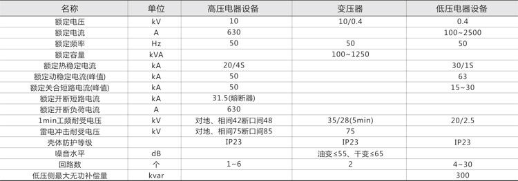 1. 本產(chǎn)品由高壓配電裝置、變壓器及低壓配電裝置聯(lián)接而成,分成三個功能隔室,即高壓室、變壓器室和低壓室,高、低壓室功能齊全,高壓側(cè)一次供電系統(tǒng),可布置成環(huán)網(wǎng)供電、終端供電、雙電源供電等多種供電方式,還可裝設(shè)高壓計量元件,滿足高壓計量的需求。變壓器室可選擇S9、SC以及其他系列低損耗油浸式變壓器或干式變壓器;低壓室根據(jù)用戶要求可采用面板或柜裝式結(jié)構(gòu)組成用戶所需供電方案,有動力配電、照明配電、無功功率補(bǔ)償、電能計量和電量測量等多種功能,滿足用戶的不同要求。并方便用戶的供電管理和提高供電質(zhì)量。